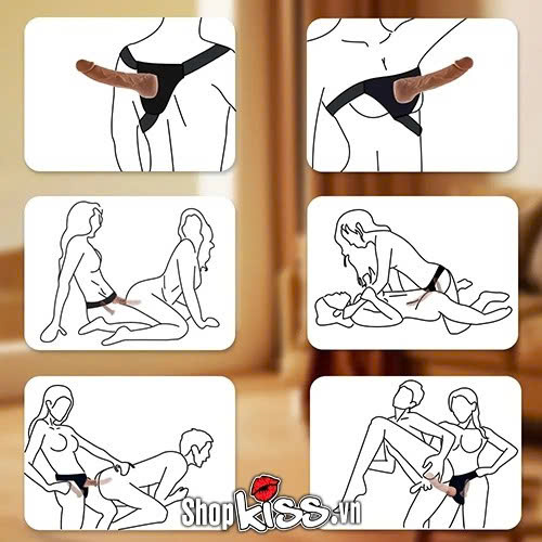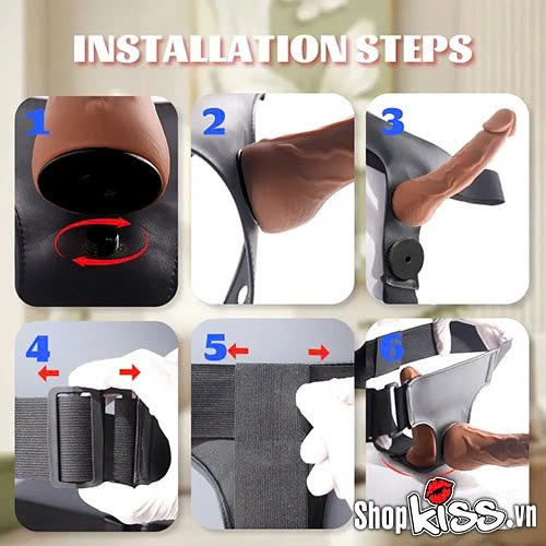 -Gắn chặt 2 dương vật giả vào đai đeo, đảm bảo dương vật giả nhỏ hướng vào trong, dương vật giả lớn hướng ra ngoài.